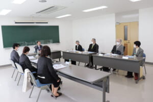 理事の方々が出席した証として、マスクを外して写真撮影を行いました。アクリルパーテーション全員分、除菌機能付き空気清浄機を使用し、感染予防対策を十分に行っています。