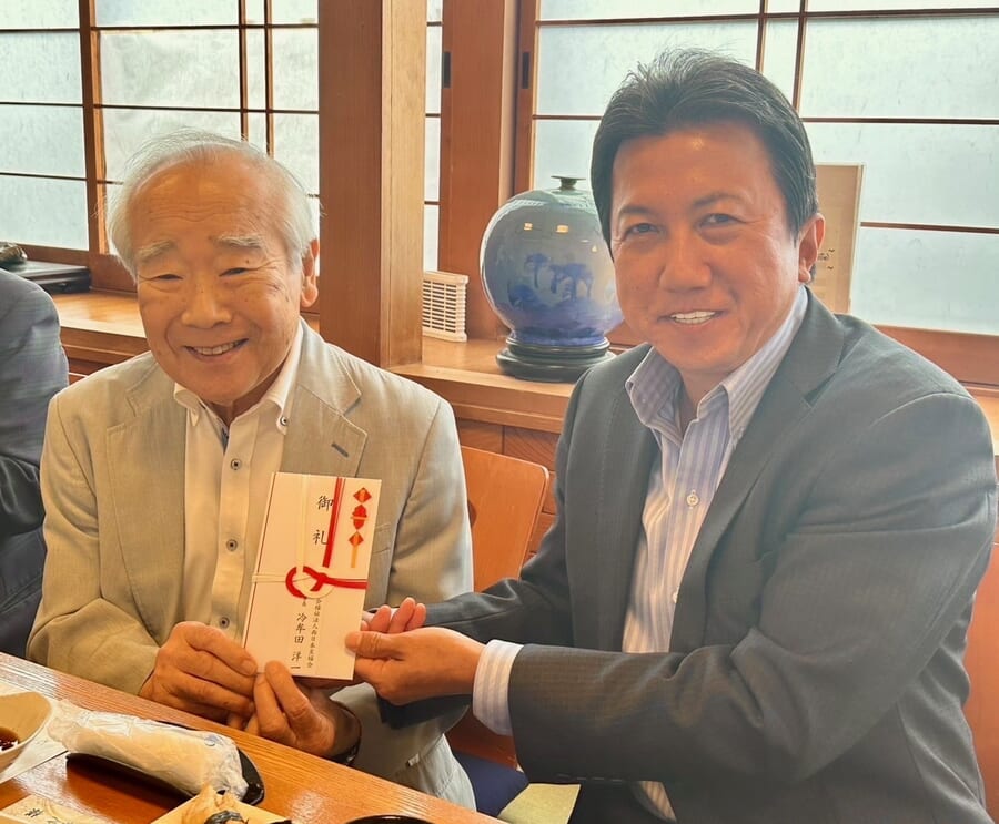 井手泰之医師への感謝を伝える冷牟田洋一理事長