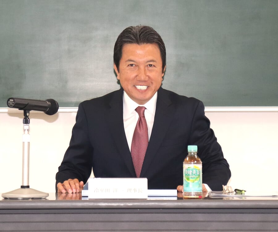 経営報告と挨拶をする冷牟田理事長